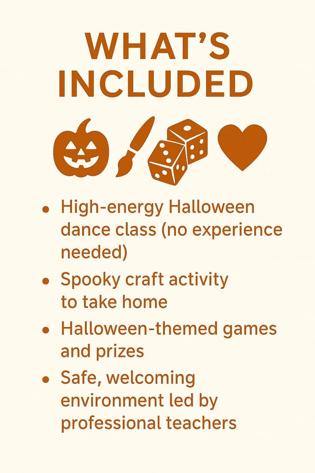 This October, our experienced dance teachers invite your child to a spook-tacular afternoon of fun! They'll learn an exclusive Halloween themed dance routine, create their own spooky keepsake during our craft session and enjoy thrilling games with new friends.